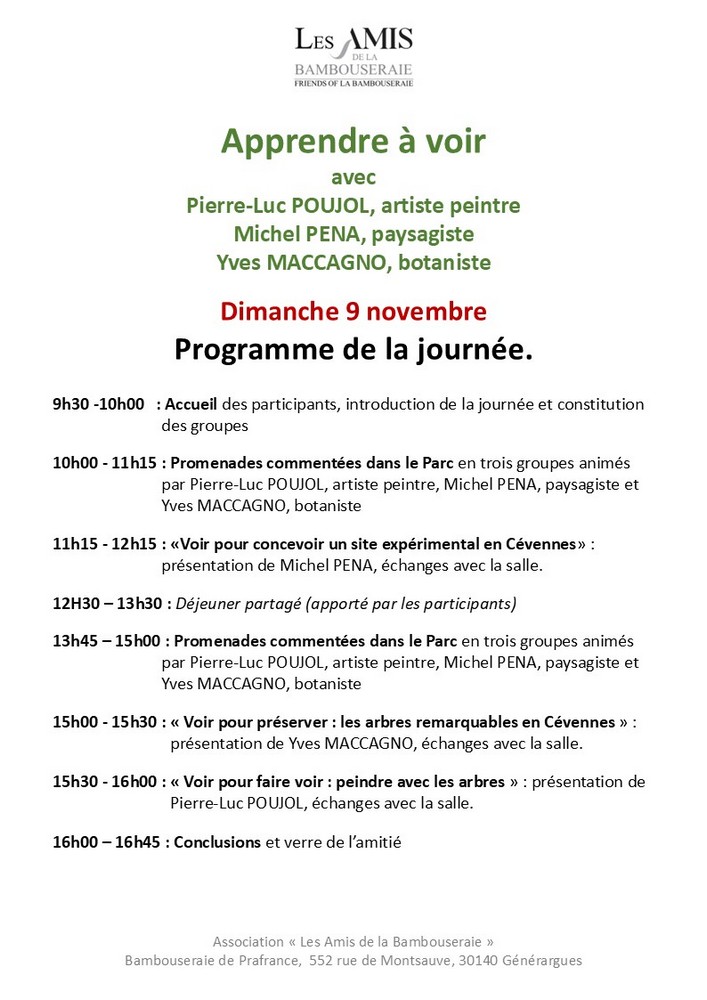 _______________________________________________________________________________ Une belle participation pour notre quatrième journée des peintres du 22 avril 2023 Les artistes nous proposent des regards souvent peu révélés dans les journées précédentes. Notre reportage photo est en ligne. _______________________________________________ « Approche historique (1856-1889) de l'Arboretum du domaine de PRAFRANS, une création d'Albert Eugène MAZEL (1828-1890)» Texte de la conférence d' Alix Audurier Cros, Professeur émérite en Architecture, historienne des jardins, présentée lors de la Journée du 13 novemebre 2022. ____________________________________________________________________________ Les photos de nos ateliers de la Journée des Plantes du 16 octobre sont en ligne ___________________________________________________________________ Les photos de notre 4ème Journée des Peintres sont en ligne ____________________________________________________________________________________________________________________ La conférence d’Ekaterina KOULECHOVA sur l'IKEBANA a conquis son public Nous partageons avec vous quelques photos de la journée ________________________________________________ Concours de nouvelles "Crayons en balade aérienne" Les lauréats du concours 2020 ont été révélés par le jury lors de la Journée des Plantes du 17 octobre 2021. Manège enchanteur de Didier TRICOU (1er prix ) Les nœuds qui assurent d’Aymeric BIARD (2ème prix) Vous pouvez télécharger le Recueil des textes sélectionnés par le jury en cliquant ICI _________________________________________________________________________________ Journée des plantes du 17 octobre 2021 Notre Atelier de construction de mobiles a encore eu beaucoup de succès ! Découvrez notre reportage photo ICI ____________________________________________________________________________________ Connaissez-vous la Balade Aérienne de la Bambouseraie ? Le reportage de ViaOccitanie vous invite à la découvrir sans tarder . https://viaoccitanie.tv/une-balade-aerienne-dans-les-cevennes-jusqua-la-cime-des-bambous/ ___________________________________________________________________ Un superbe reportage au journal de 20h du 26 juin de France 2 "Un petit coin de zen au beau milieu des Cévennes. La bambouseraie d'Anduze (Gard) réserve bien des surprises".